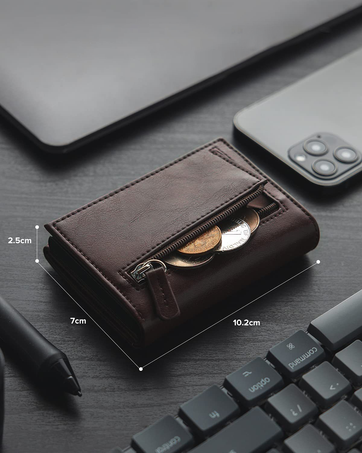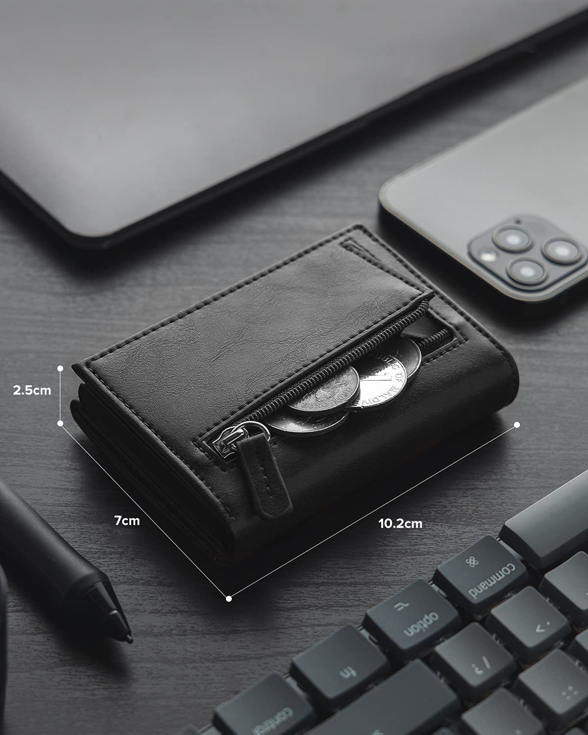 Capable de contenir monnaie, billets et jusqu’à 10 cartes, il combine praticité et design compact, se glissant facilement dans votre poche ou votre sac sans sacrifier l’élégance.